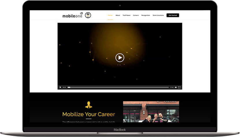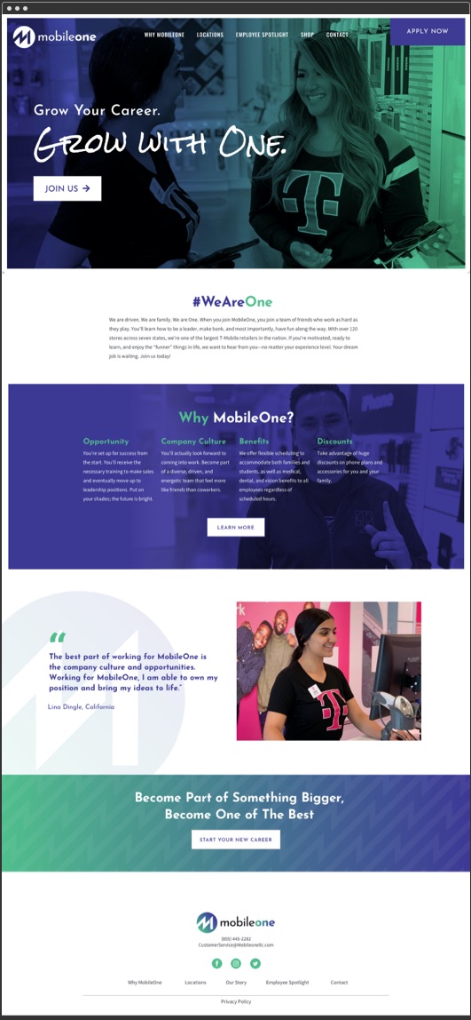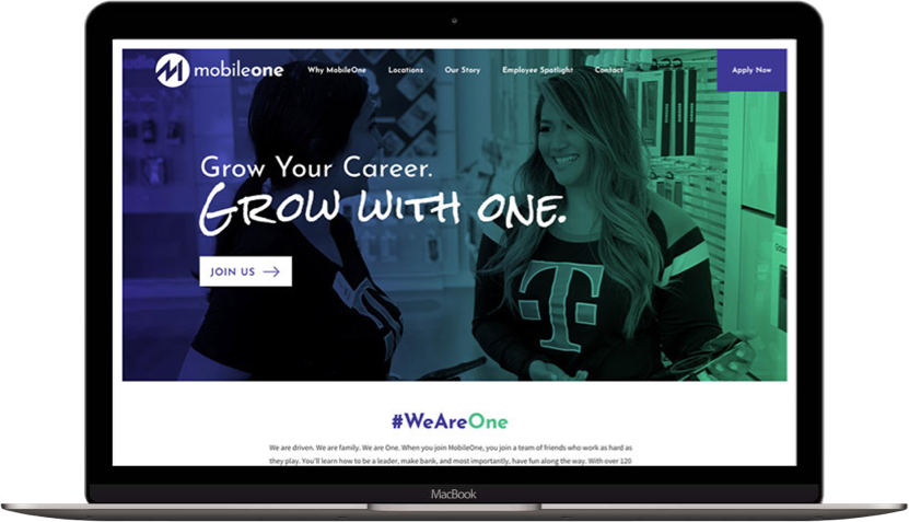 I produced a new logo design that consisted of the characters “M” and “1” stylishly fused on a vibrant blue-to-green color gradient. The new website design showcased the company culture, benefits and why a site visitor would want to work at MobileOne.